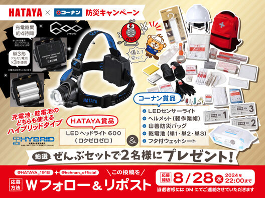 ホーム > 会社案内 > お知らせ > Xキャンペーン開催!防災お役立ち コラボキャンペーン HATAYAとコーナンが送る! 災害時に役立つ商品を集めたセットをプレゼント!
